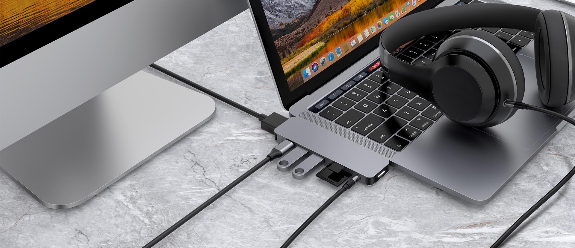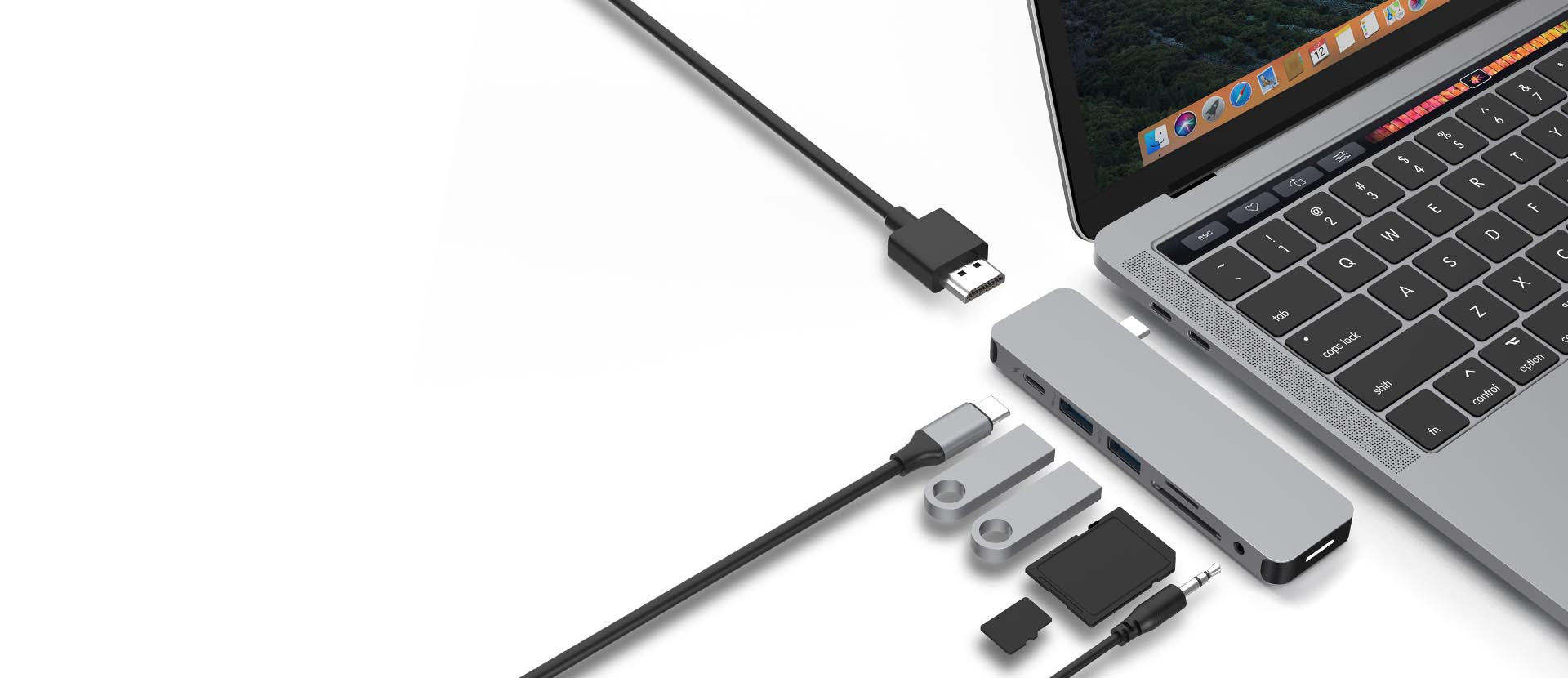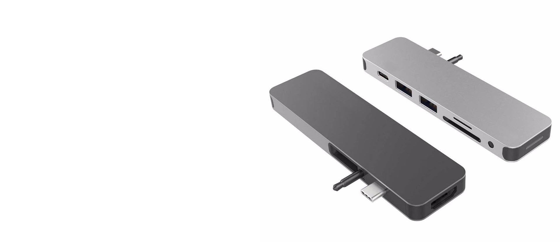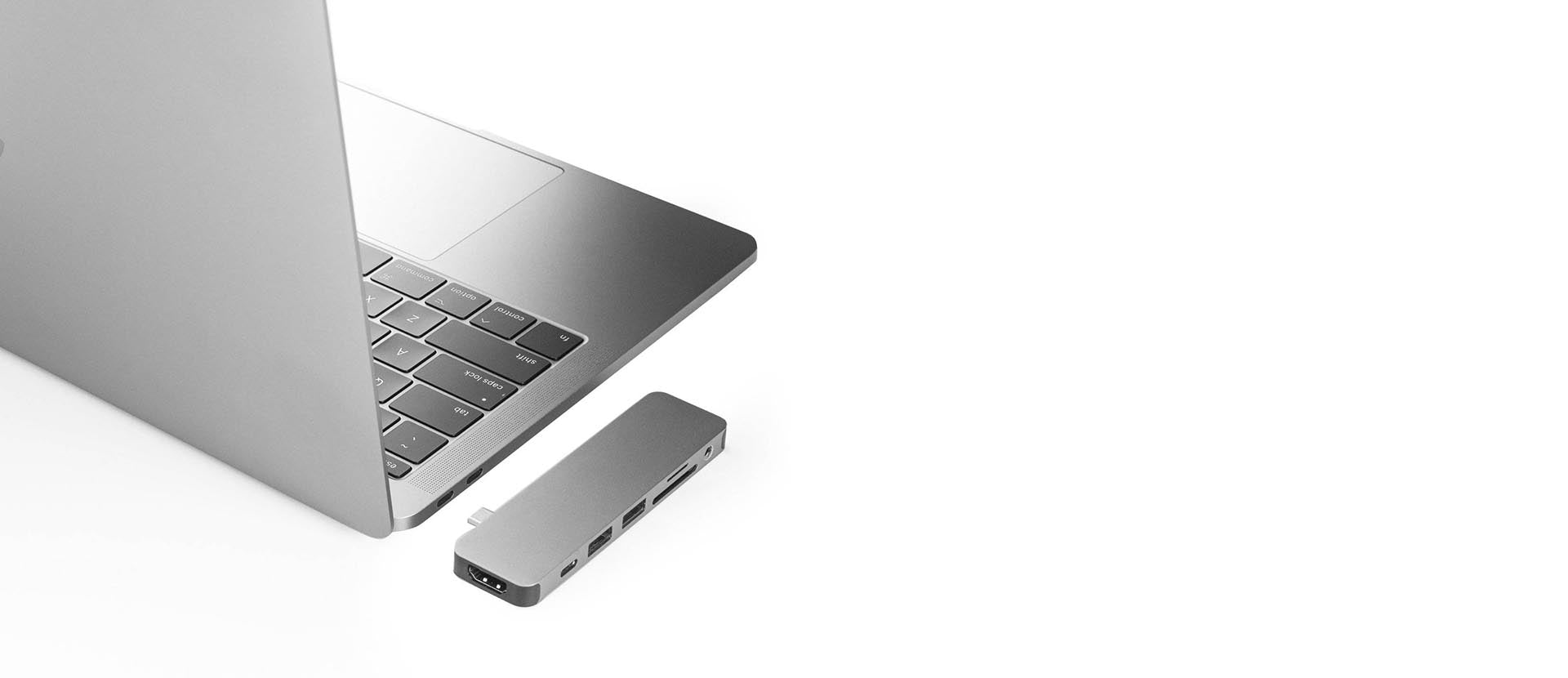 Form-fitting USB-C Hub for MacBook Pro and Air. This USB-C docking station attaches to MacBook adding 7 ports: 4K HDMI output, USB-C power delivery, and more.